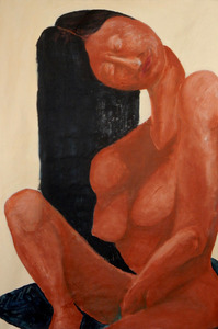 2021geabstraheerd portret van een zittende, naakte vrouw met een terracotta huid en lang zwart haar